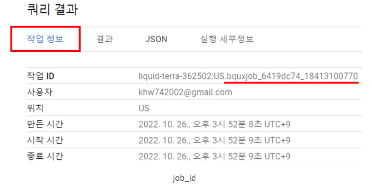 get_job 인자에 작업 ID를 입력한다. 그리고 job.query()를 통해 쿼리문의 결과를 colab에서 출력할 수 있다.