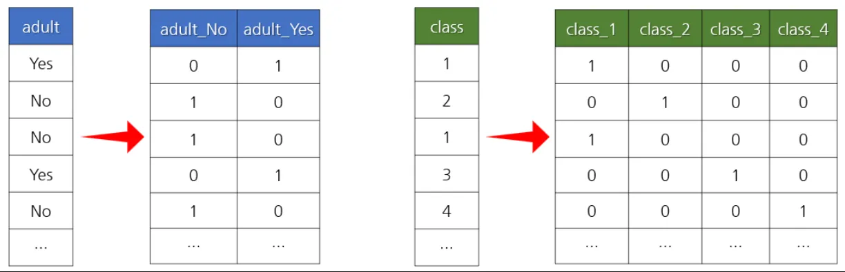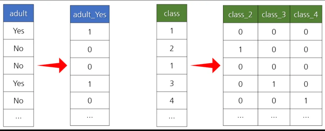 범주형 데이터를 독립된 열로 변환하는 것을 말한다.