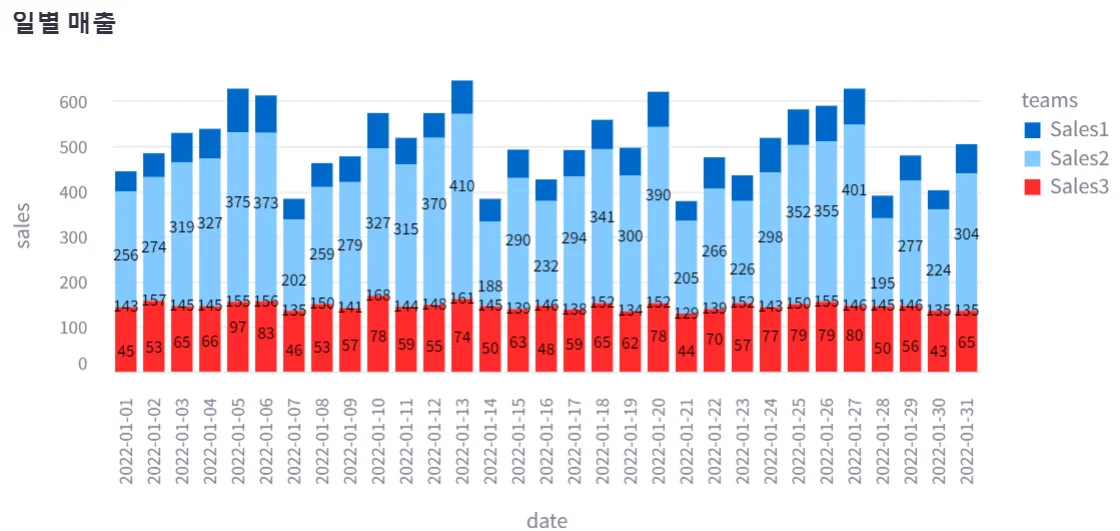 chart = alt.Chart(df_melted, title='일별 매출').mark_bar().encode(
