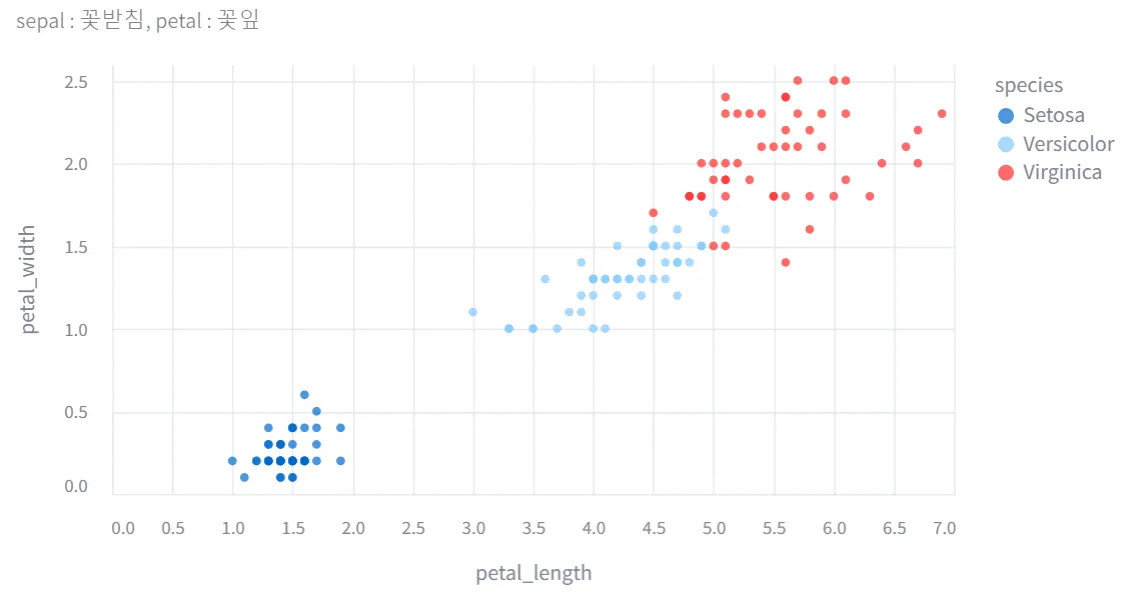 st.caption('sepal : 꽃받침, petal : 꽃잎')