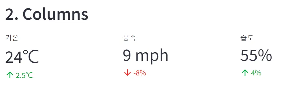 # col1, col2, col3 = st.columns([2, 1, 1]) -> 똑같이 3열을 생성하는데, 첫번째 열에서 2만큼의 자리를 생성
