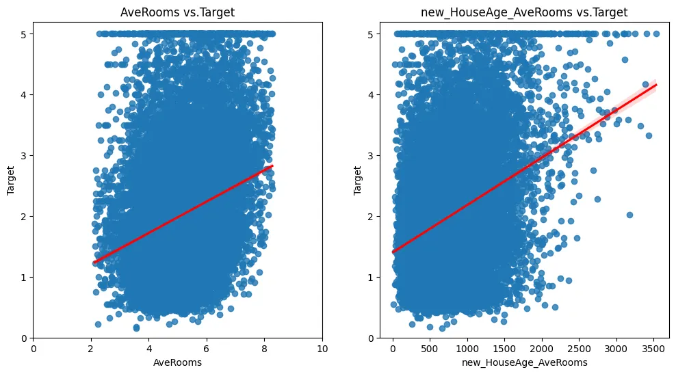 sns.regplot(x='new_HouseAge_AveRooms', y='target', data=housing_df, line_kws={'color':'red'}, ax=axs[1])