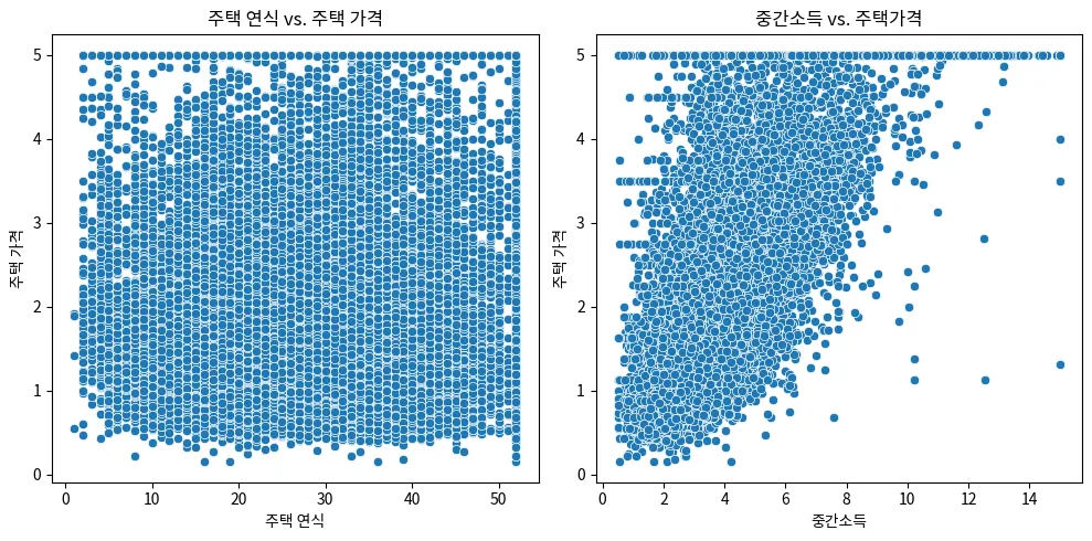 ‘중간 소득’ - ‘주택 가격’ , ‘주택 연식’ - ‘주택 가격’ 의 관계를 알아보자.