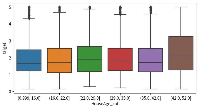 housing_df['HouseAge_cat'] = pd.qcut(housing_df['HouseAge'], q=6)