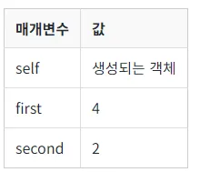 다음과 같이 self를 제외한 2개의 매개변수 값만을 전달하면 된다.