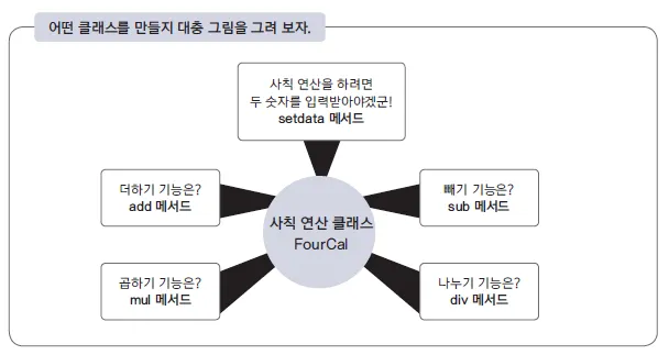 클래스를 만들 때는 항상 클래스로 만든 객체가 어떻게 작동할지를 생각해서 차근차근 만들어나가는 것이 중요하다.
