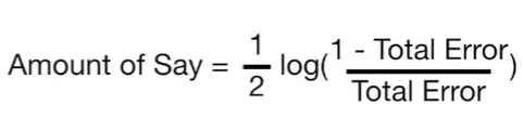 total error가 0에 가까울수록 amount of say는 큰 양수값을 갖는다. total error가 1에 가까울수록 amount of say는 극단적인 음수값을 갖는다.