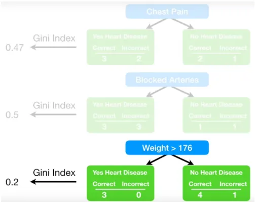 위의 과정을 반복하여 모든 feature(Chest Pain, Blocked Arteries, Patient Weight)에 대한 stump를 만들어보면 다음과 같다.