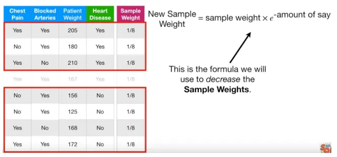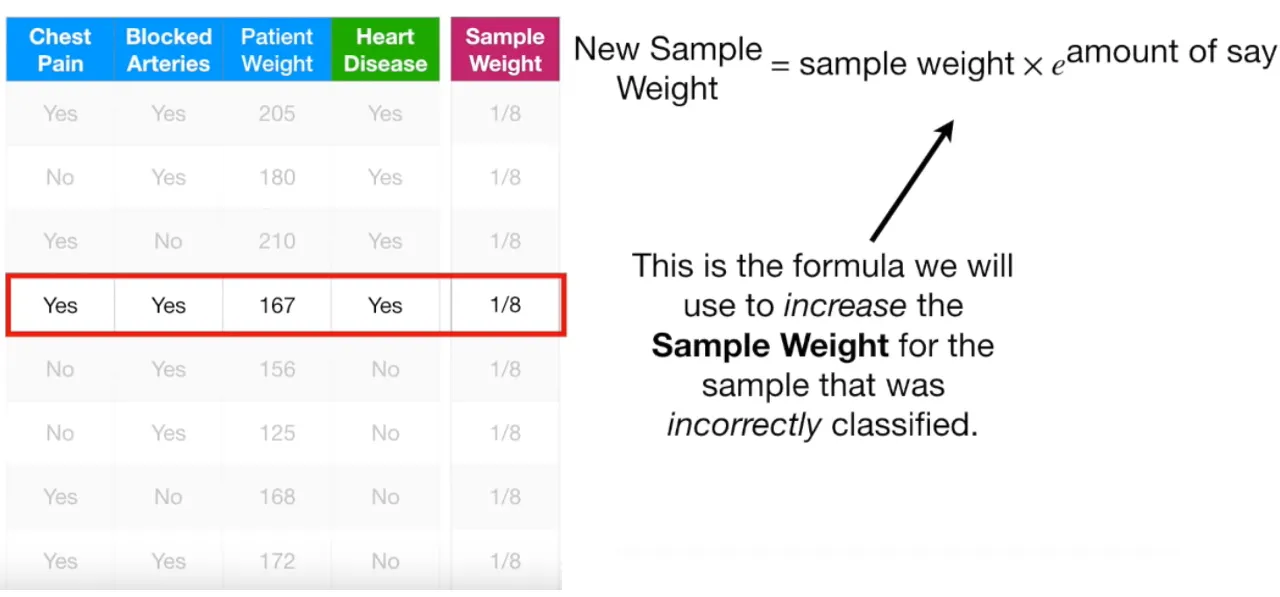 가중치는 다음 공식을 적용하면 New Sample Weight = (1/8) * e^(0.97) = (1/8) * 2.64 = 0.33가 나온다.기존의 1/8 (=0.125)보다 훨씬 높은 결과이다.