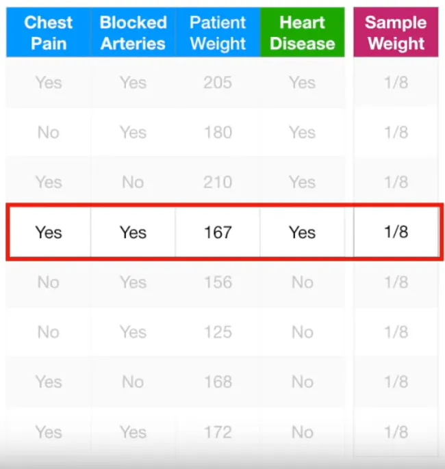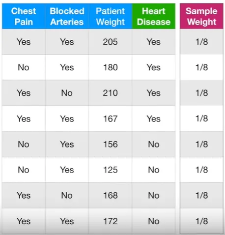 먼저, sample weight 는 각 샘플 모두 동일하게 1/8 이다. 레이블은 Heart Disease 다.