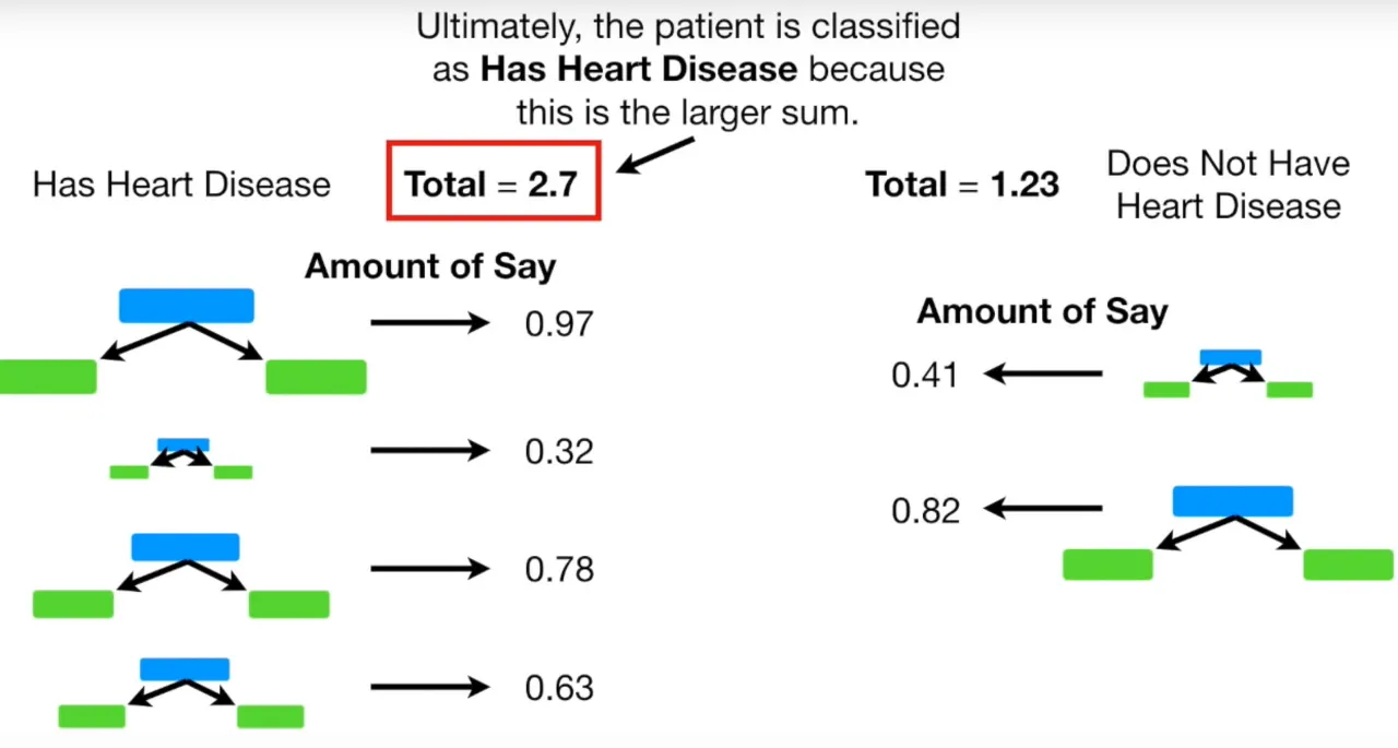 결과를 보면 Label이 'Yes'인 경우(Has Heart Disease) Label ‘No’ 라고 분류한 경우보다 total amount of say가 2.7로 더 크기 때문에 Yes라고 결론을 내린다.
