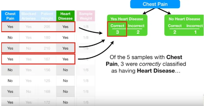 Chest Pain은 Label(Hear Disease)가 'Yes' 'No' 두개로 나뉜다. Yes Heart Disease 리프를 살펴보자. Label이 Yes이고, Chest또한 Yes인 경우는 1,3,4열인 3개이다. 이렇게 리프를 채우면 하나의 stump가 만들어진다.