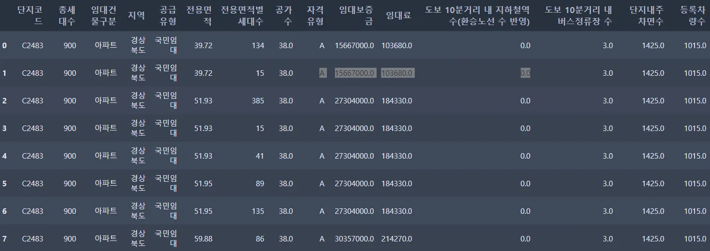 중복되는 데이터들을 따로 모아 중복을 제거해주고 단지코드가 key column 이 될 수 있도록 해주는 작업이 필요하다.