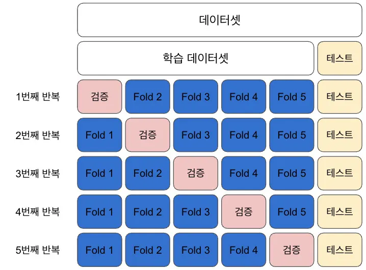 # KFold 분할기 인스턴스 생성 (5-겹 교차 검증)