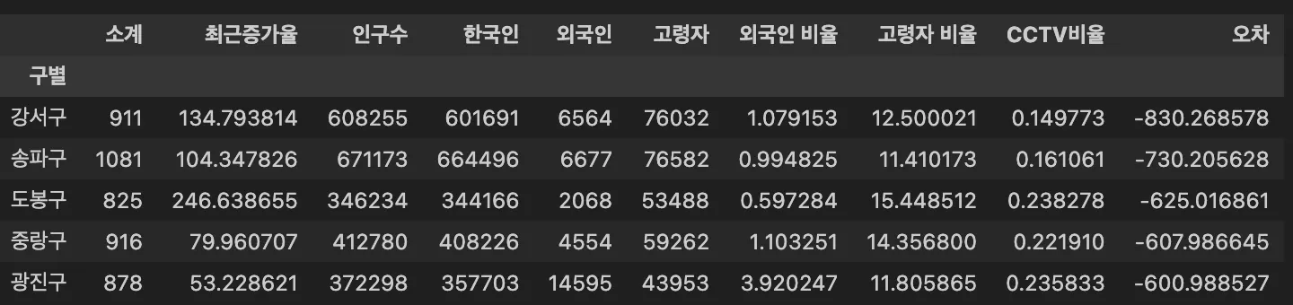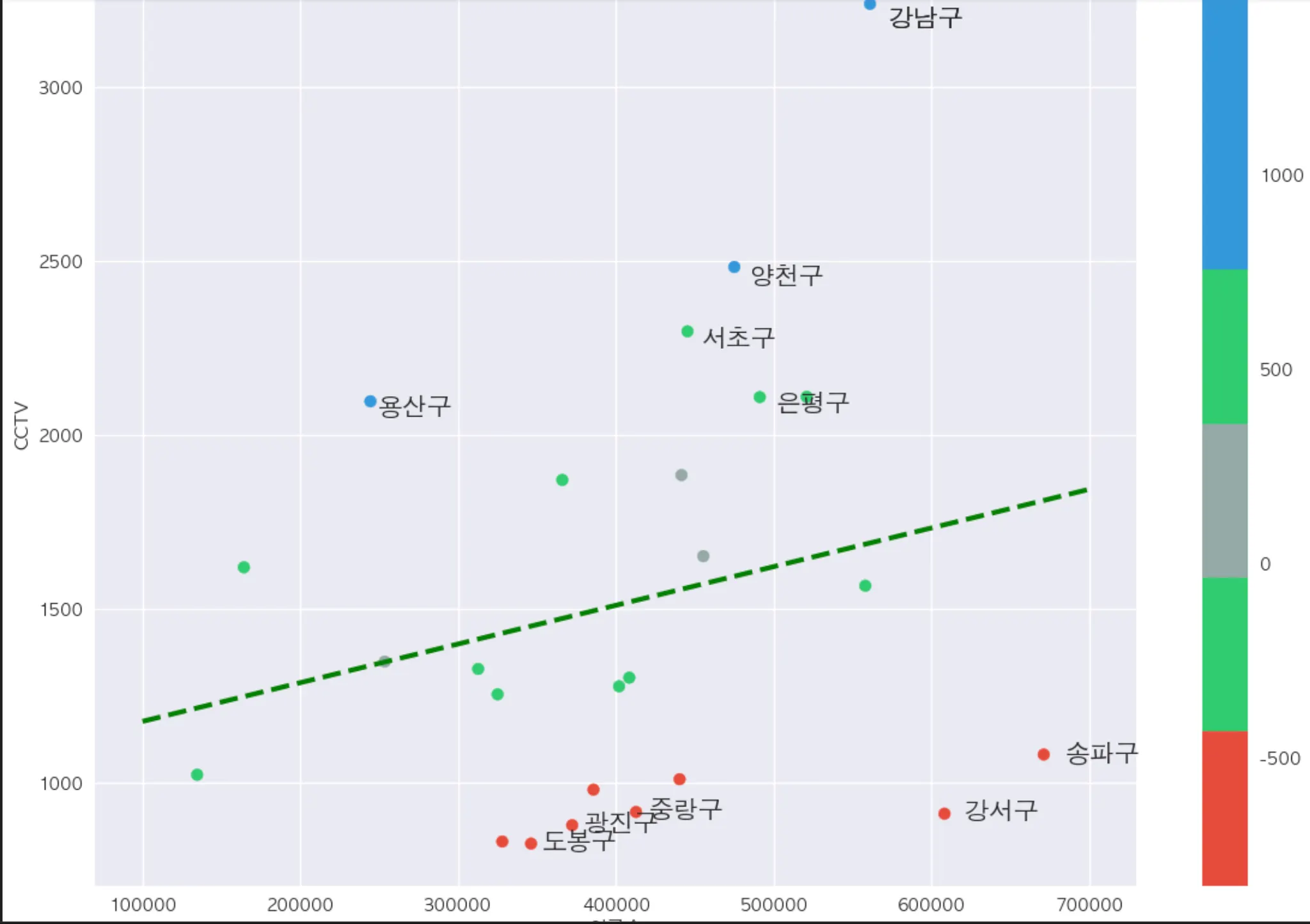 즉, 경향 대비 훨씬 많은 CCTV 를 보유하고 있는 지역을 알아볼 수 있다. (강남구 > 양천구 > 용산구 >…)