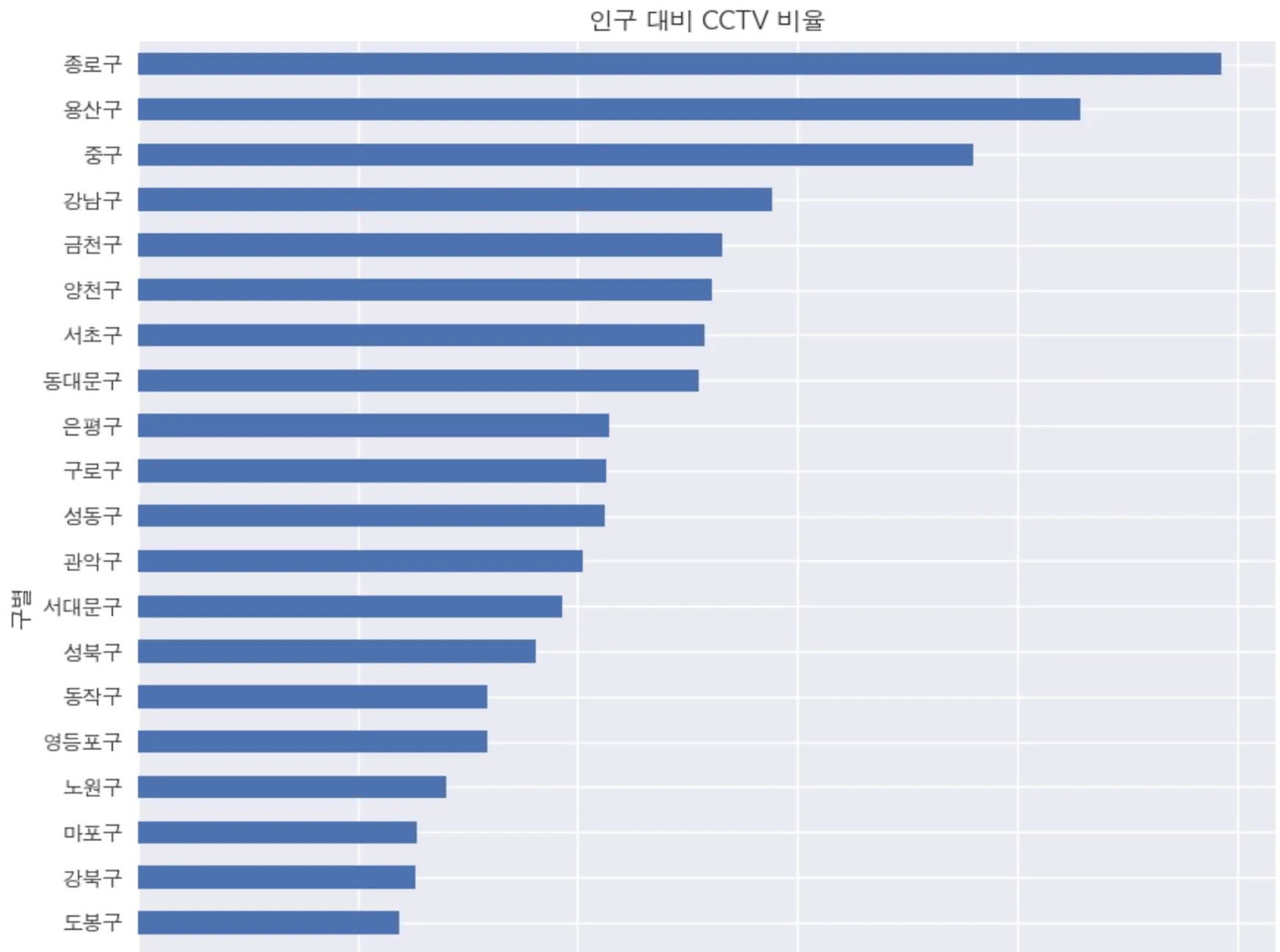 강서구 > 송파구 > 도봉구 > … 순으로 인구수 대비 CCTV 보유대수가 경향보다도 훨씬 적은 것을 파악할 수 있다.