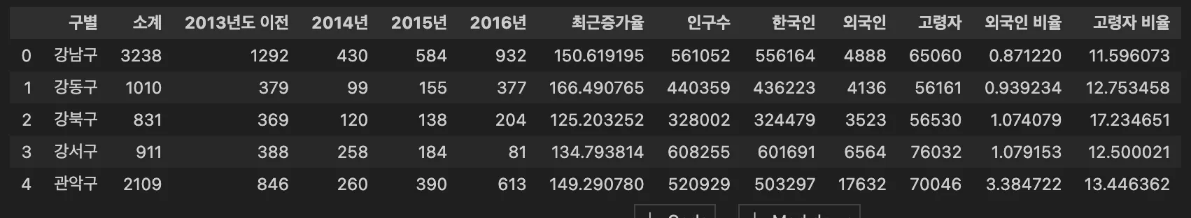 pop_seoul['외국인 비율'] = pop_seoul['외국인'] / pop_seoul['인구수'] * 100
