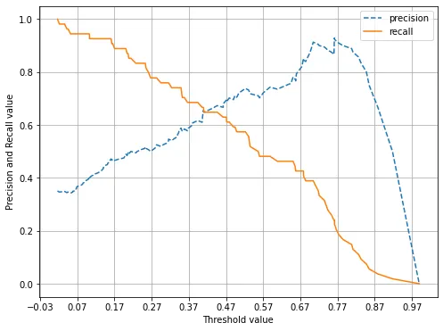 이제부터는, 임계값을 변화시키면서 재현율 값의 성능 수치가 어느 정도나 개선되는지 확인해보자.