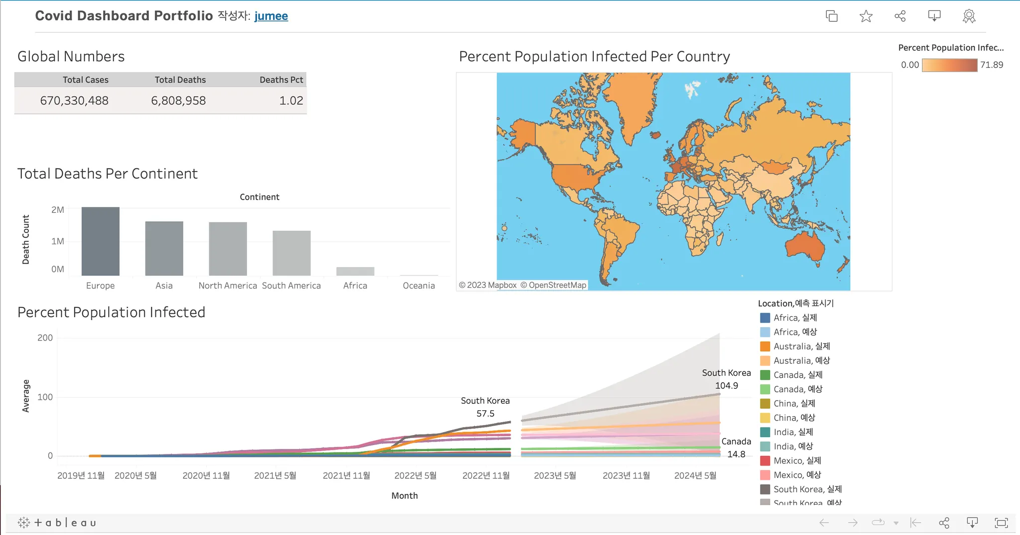 국가별 누적 감염 비율을 비교할 수 있었고 우리나라의 경우, 2023년 2월 7일 기준 약 56% 가 되는 것을 확인했습니다. 2024년 5월 우리나라 전체 누적 감염비율이 100% 가 될 것으로 예측할 수 있었습니다.