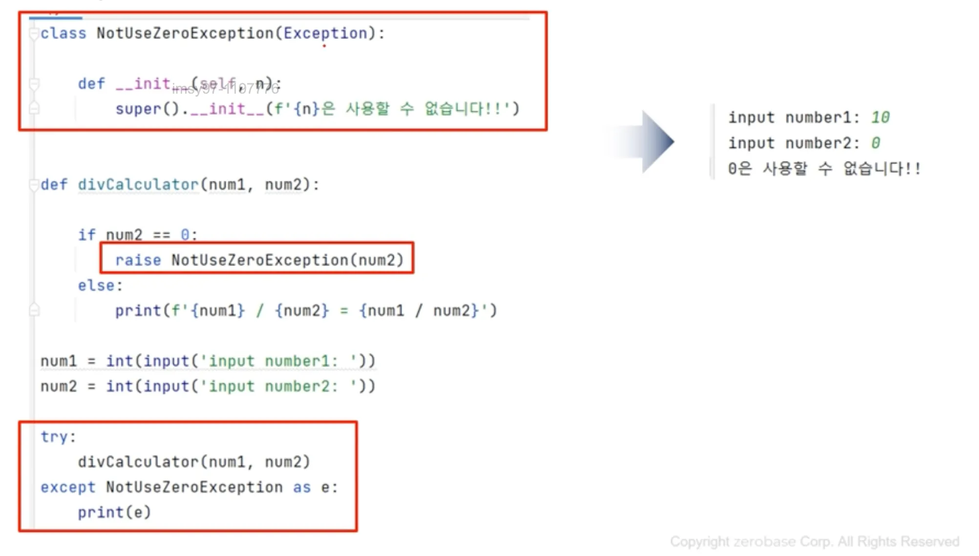 raise Exception('0으로 나눌 수 없습니다.') # 강제로 예외를 발생(만들어)시킴