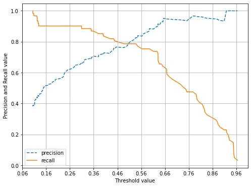 # precision_recall_curve() API는 임계값에 따른 값 변화를 곡선 형태의 그래프로 시각화