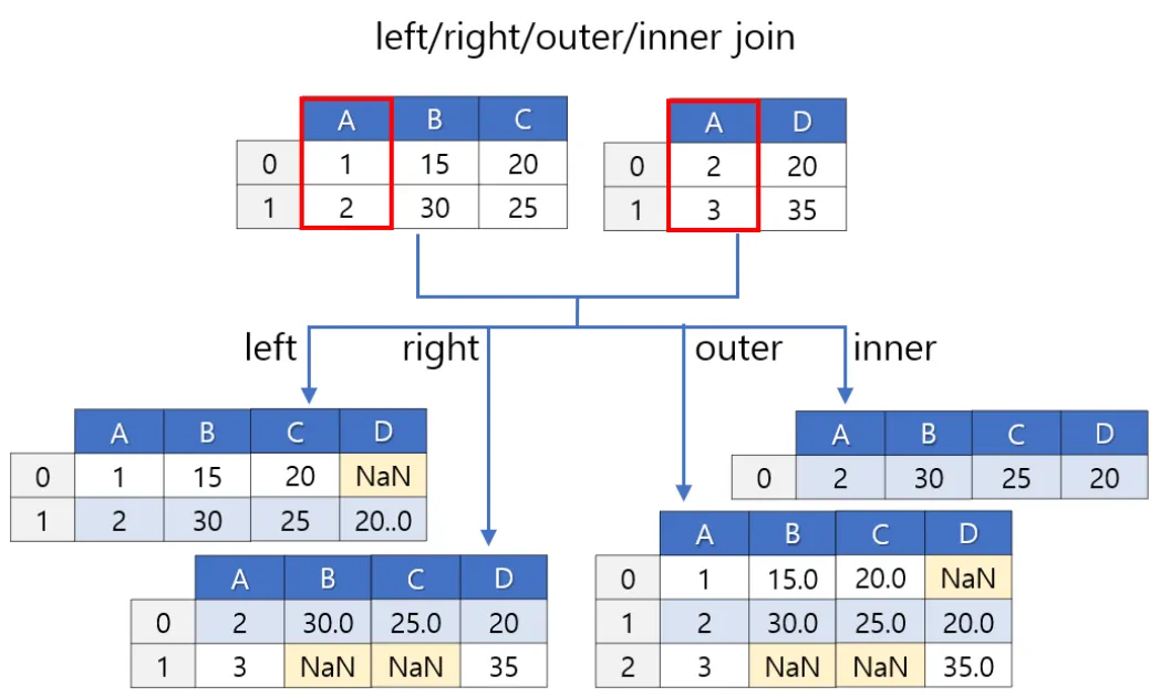 join = ‘outer’ (default) : 모든 데이터들을 연결한다.