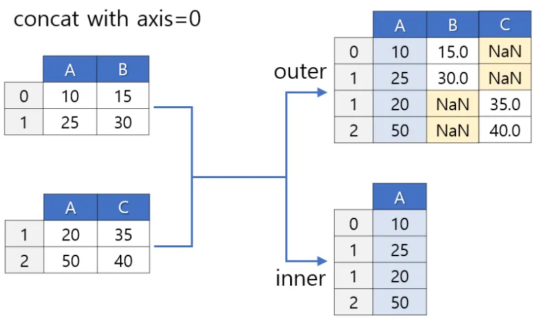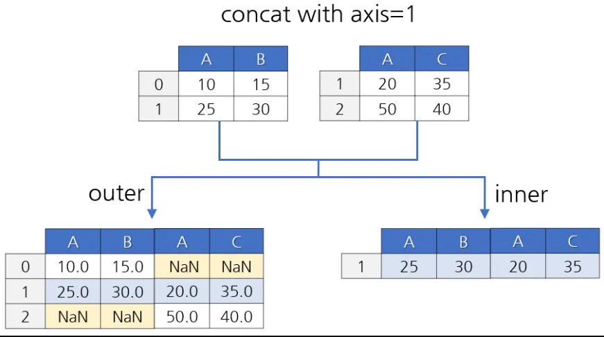 pd.concat([df1, df2], axis=1(또는 0), join=’outer’(또는 ‘inner) )