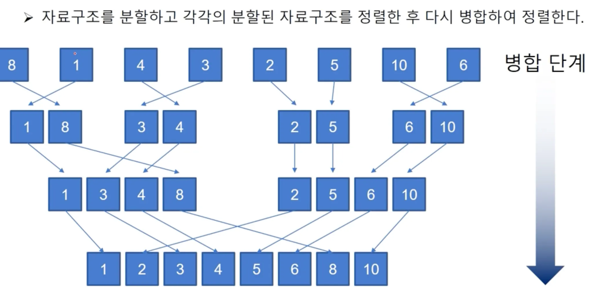 자료 구조를 분할하고 각각의 분할된 자료구조를 정렬한 후 다시 병합하여 정렬하는 방법