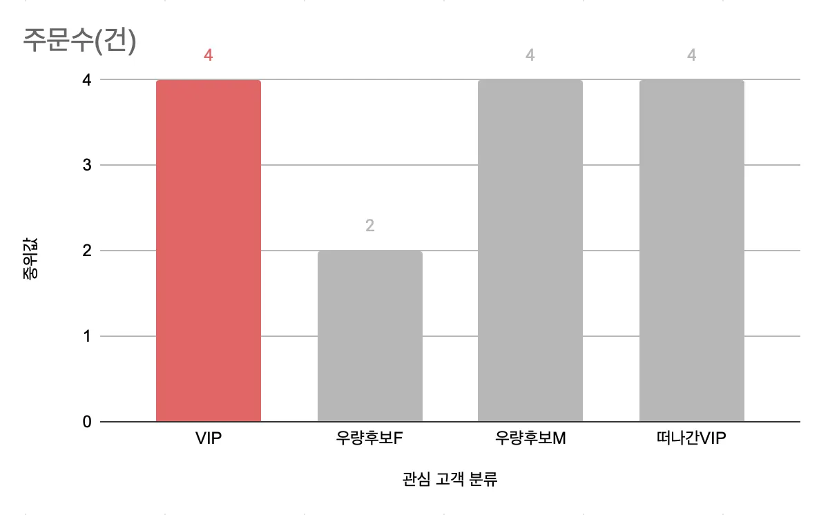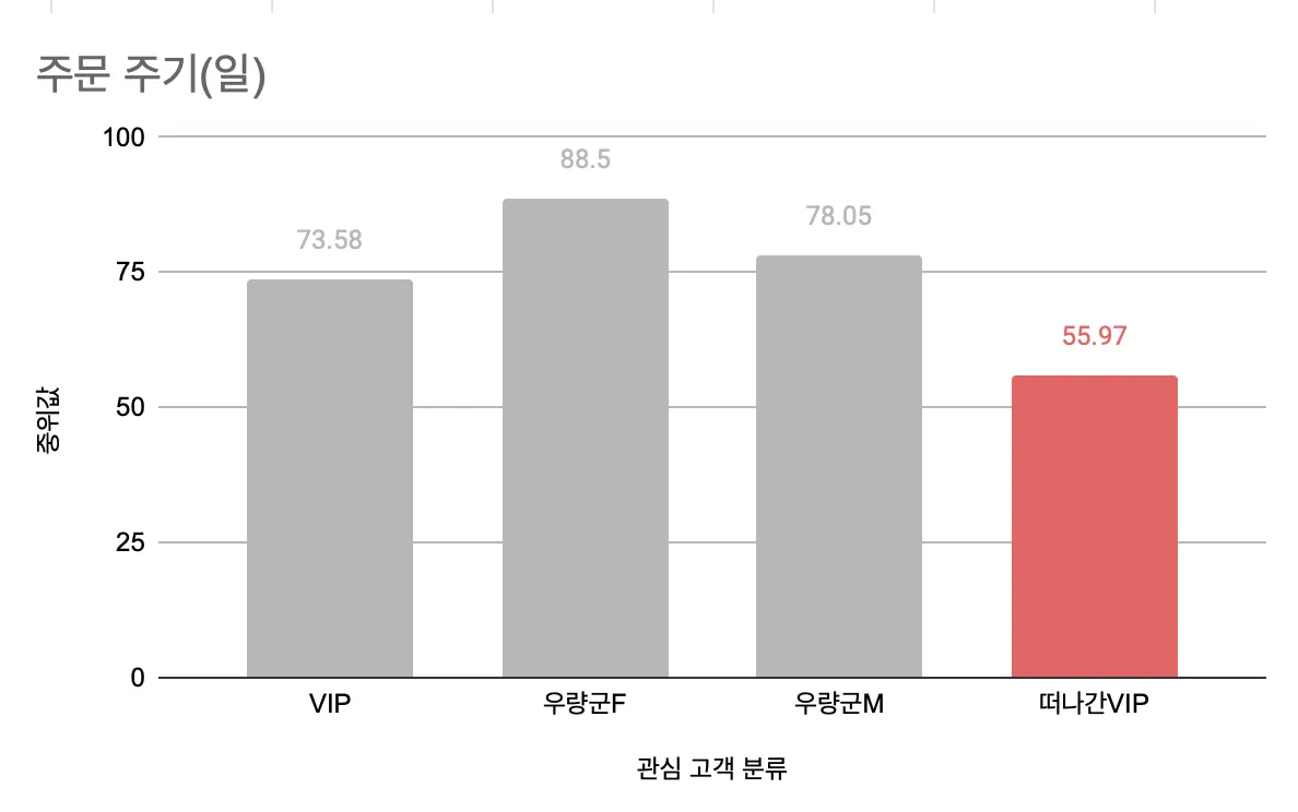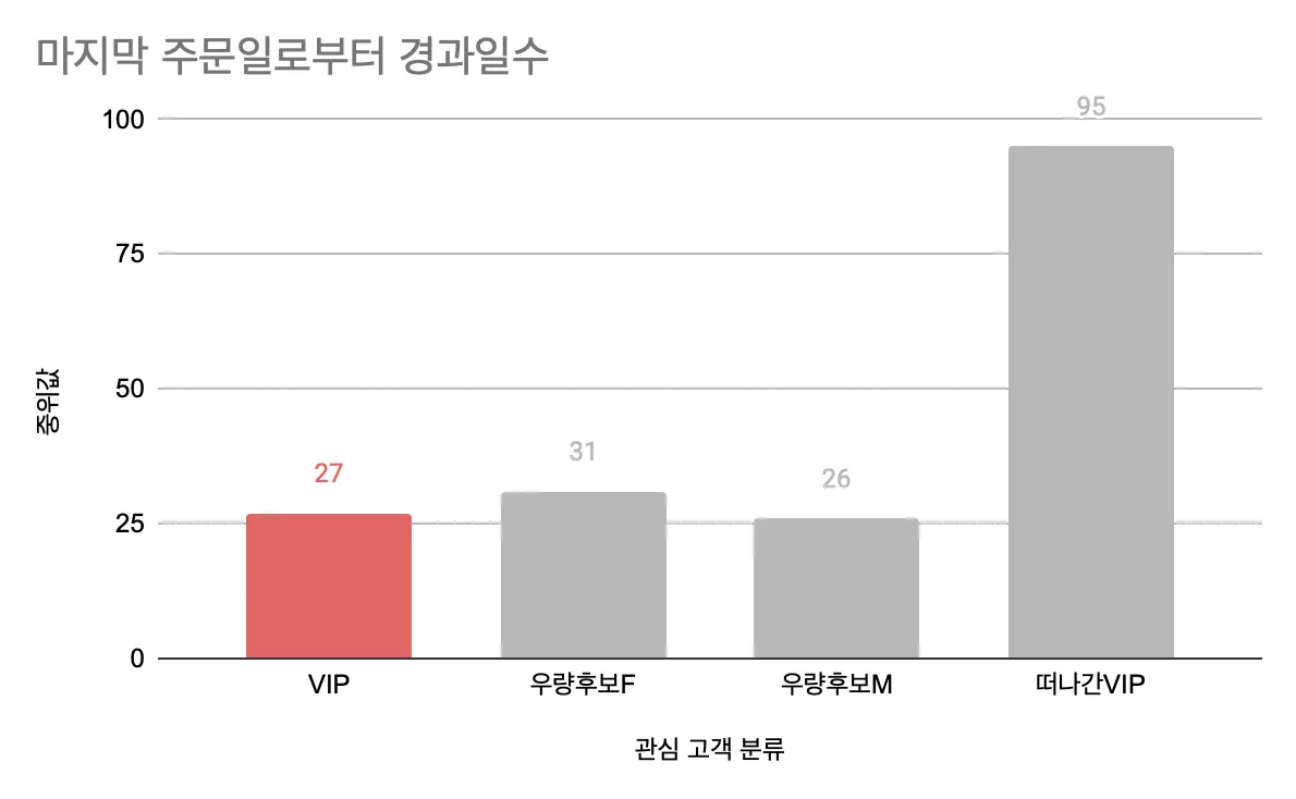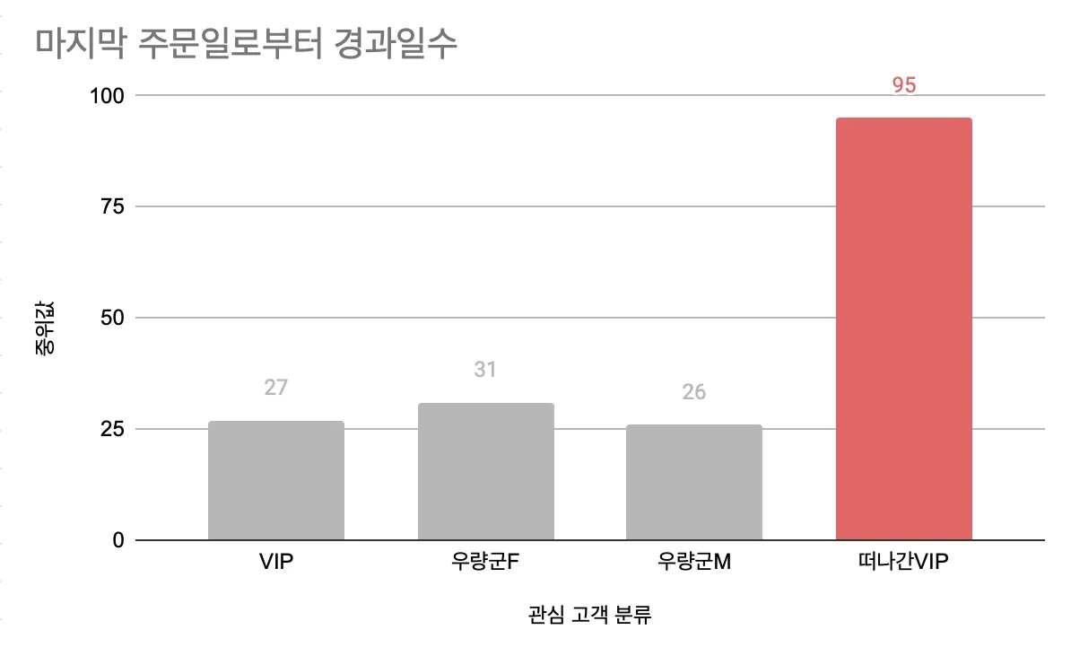 즉, 떠난 VIP는 구매력뿐만 아니라 서비스를 적극적으로 활용하는 유저였다는 것을 파악할 수 있습니다.
