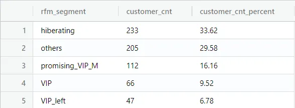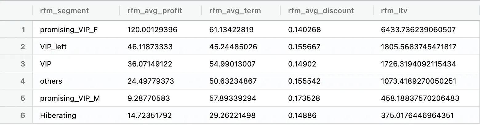 위의 promising_VIP_F은 구매력이 갖춰진 고객이지만 상대적으로 이용 빈도는 낮습니다. 해당 고객군에게 좋은 구매 경험을 제공한다면 높은 LTV를 가져다줄 가능성이 높습니다.