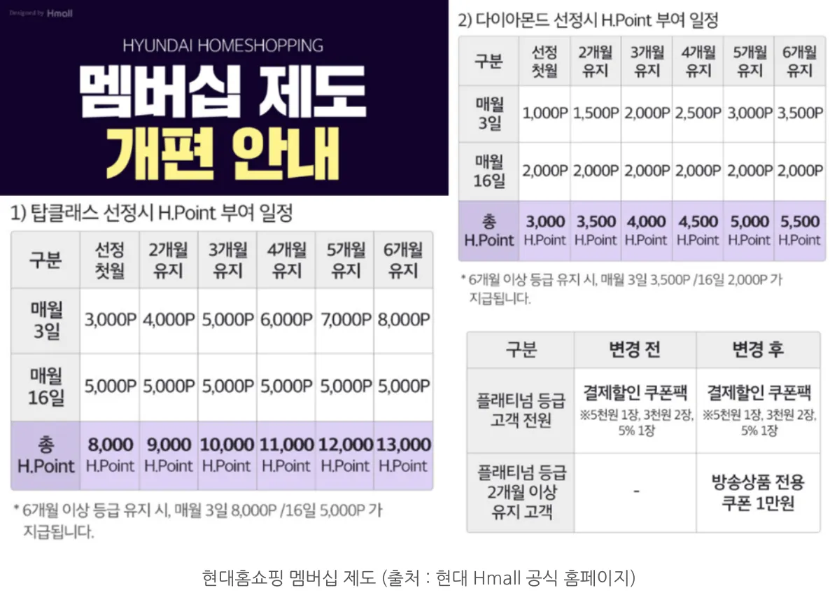 다음의 예시는 ‘현대홈쇼핑’의 멤버십 제도입니다. 고객 멤버십별로 제공하는 할인 쿠폰팩과 적립 포인트에 차등을 두는 마케팅을 활용하고 있습니다.