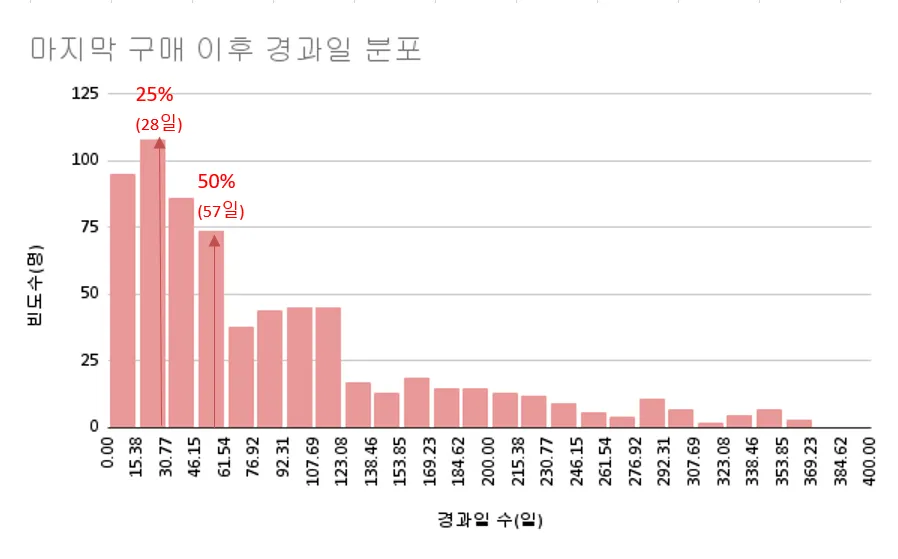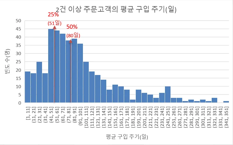 → 상위 50%의 구입자는 1~80일 사이(3달 이내)의 구입 주기를 가지고 있습니다.