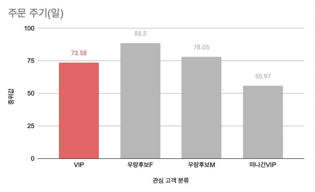 VIP_left 의 마지막 주문일로부터 경과일수의 중앙값은 95일로 중요 고객군 중 가장 길지만 이전의 구매 주기는 가장 짧았던(중앙값 : 56일) 고객이라는 사실을 확인할 수 있습니다.