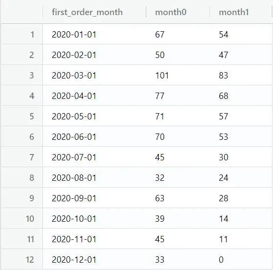 첫 주문 이후 마지막 기준 12월달까지 롤링 리텐션 비율
