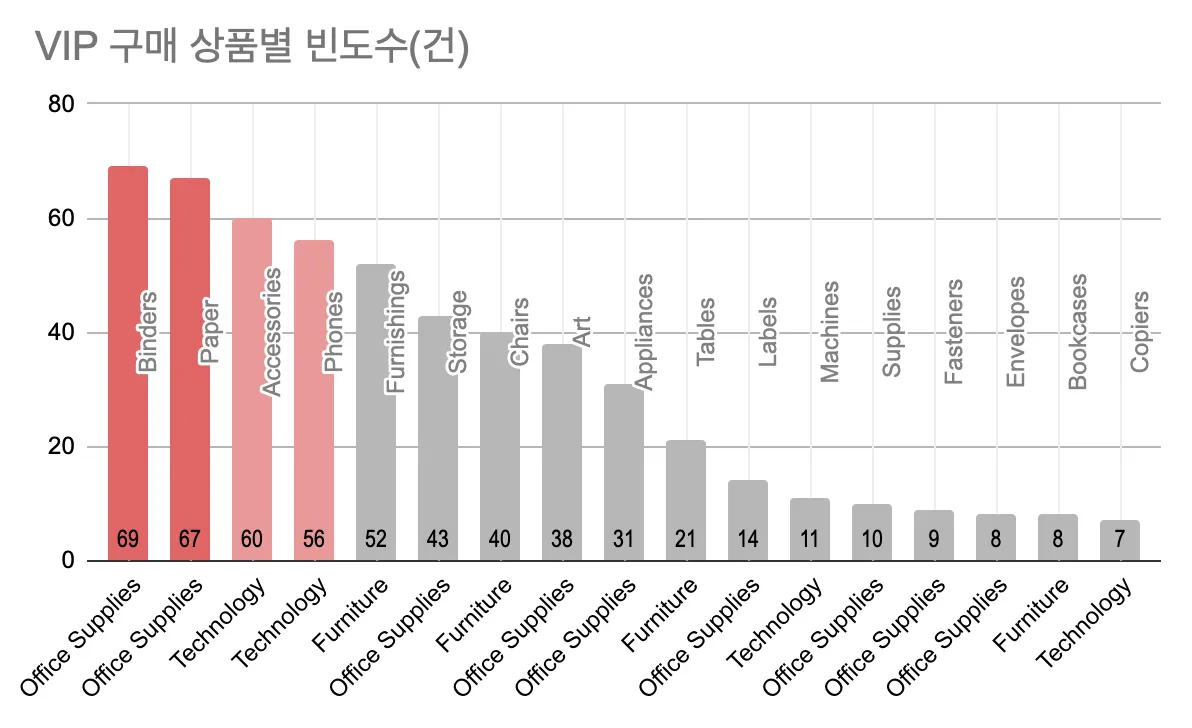 바인더, 종이가 VIP고객군이 가장 많이 구매하는 상품이라는 것을 확인할 수 있었습니다.
