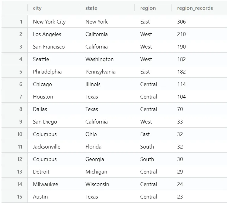 records 테이블에는 city(도시), state(주), region(지역) 데이터가 존재합니다. 해당 데이터들을 활용해서 어떤 지역에서 해당 서비스를 많이 사용하는지, 어떤 상품을 주로 구매하고, 어떤 소비자군이 분포하는지 확인해보도록 하겠습니다.